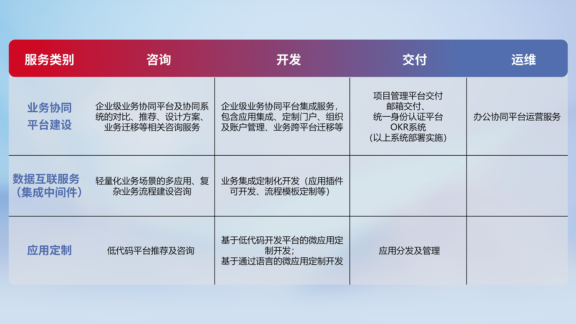 针对钉钉、、、企微、、、、IDaas等平台级产品提供产品的规划、、、、方案、、交付、、、定制化开发等服务,,,实现如统一协同办公、、智能客户服务、、混合会议管理、、智能数据查询、、、、等业务场景,,,,实现数字化转型。。
