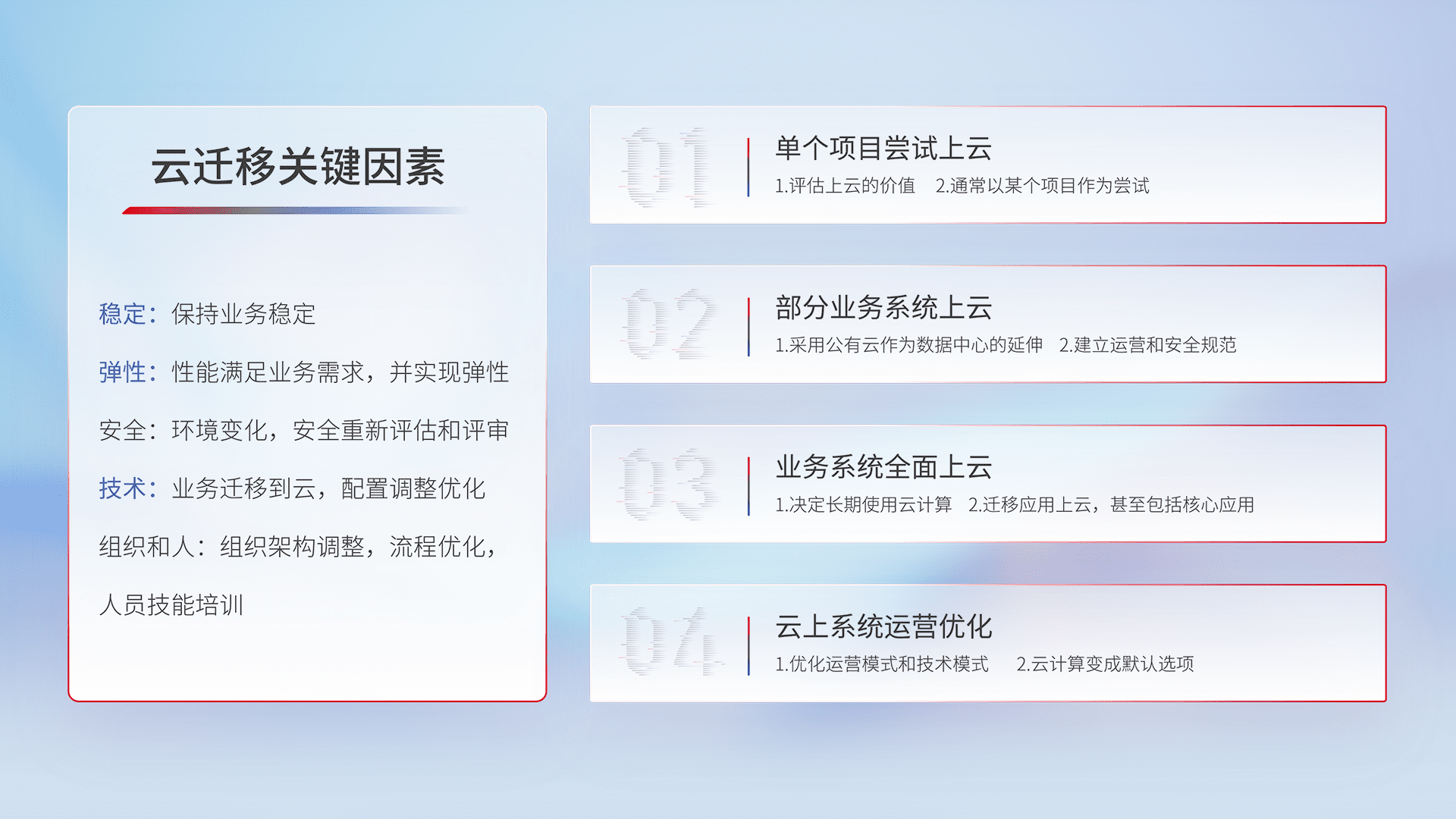 结合实际业务,,,,从规划设计、、、云平台选型、、、云原生改造、、数据迁移、、、、集成交付,,,迁移全过程为客户识别最佳上云路径,,,做好风险识别管理,,设计网络架构、、身份权限、、安全审计合规、、操作审计、、、日志审计、、、、监控告警策略、、、多站点容灾设计等,,,对云上基础设施进行整体规划,,,提升IT治理水平,,,以满足弹性、、、高可用、、高性能的需求。。。
