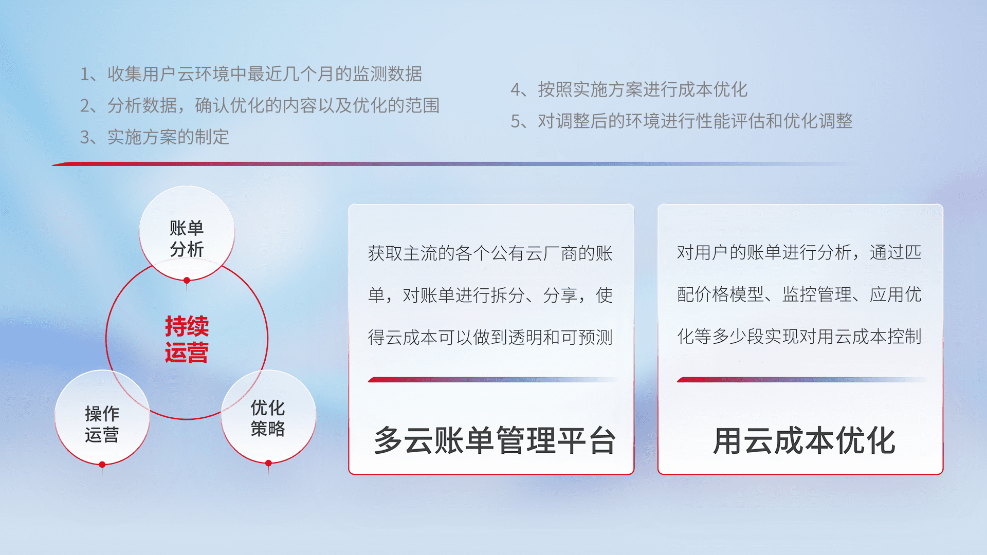 通过多云纳管,,以统一的资源数据模型把客户的云资源进行抽象和封装,,,进而实现对多云资源的统一操作,,保障云资源管理的可靠性、、、、稳定性与可用性。。量身定制化运维内容,,配置、、、开发运维、、补丁管理、、、备份、、、、监控、、、认证和访问管理、、、、审计和日常巡检等,,,保障在用云过程中的可靠度,,,稳定度以及高可用率。。。。
